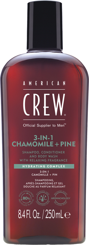 Das American Crew 3-in-1 Chamomile & Pine vereint Shampoo, Conditioner und Duschgel in einem Produkt. Die Formel mit Kamille und Pinienextrakt reinigt Haar und Körper gründlich, pflegt und erfrischt.